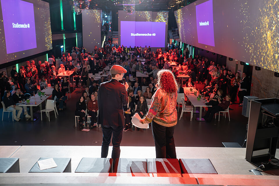 In einer Gesprächsrunde mit Absolvent:innen sowie aktuellen und ehemaligen Lehrenden blickten Gabi Ludwig, Prof. em. Siegfried Weischenberg, Julia Friedrichs, Prof. Holger Wormer, Richard Brandt und Dr. Susanne Wegner auf die Anfänge, die Nullerjahre und die Gegenwart des Instituts für Journalistik zurück. Die Auszeichnung für die lustigste IJ-Anekdote beim Reporter Slam, moderiert von Absolvent Jochen Markett, sicherten sich die Journalistik-Studierenden Amelie Borggrefe und Lukas Pazzini – mit einem augenzwinkernden Blick auf ihre ersten Studiensemester und Professor:innen, die großzügig Schokoriegel verteilen. Sie setzten sich knapp gegen Prof. Wiebke Möhring vom IJ und Absolvent Steffen Grimberg durch. Durch den Abend führten Prof. Christina Elmer, geschäftsführende Direktorin des IJ, und Institutsmanager Dr. Marcus Kreutler. Für die musikalische Untermalung sorgte die United Harriet Colliery Band der TU Dortmund.