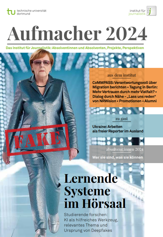In der Titel-Story „Lernende Systeme im Hörsaal" berichtet Christina Elmer, Professorin für digitalen Journalismus und Datenjournalismus, wie das Thema Künstliche Intelligenz in die Lehre am IJ integriert wird. Unter anderem gibt sie Einblick in den Kurs "Let ChatGPT do the work?", in dem Studierende das generative Sprachmodell hinter ChatGPT testen, sich die Ergebnisse ihrer Experimente vorstellen - darunter die Planung einer Radiosendung - und gemeinsam diskutieren, was sich daraus ableiten lässt.