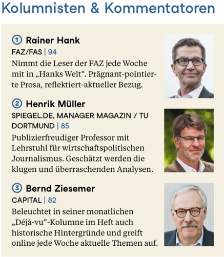 Henrik Müller, Professor für wirtschaftspolitischen Journalismus am IJ, wurde in der neu geschaffenen Unterkategorie „Kolumnisten & Kommentatoren“ für seine Kolumnen auf Spiegel.de und im Manager Magazin ausgezeichnet. Er belegte den zweiten Platz hinter Rainer Hank, Kolumnist für die Frankfurter Allgemeinen Sonntagszeitung, und vor Bernd Ziesemer, Kolumnist für die Zeitschrift Capital.