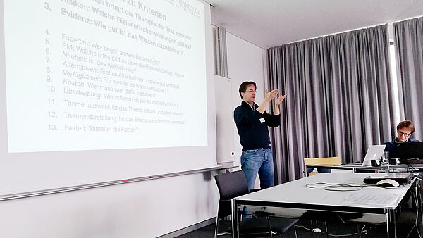 Zum Auftakt berichtete der Wissenschaftsjournalist Marcus Anhäuser, langjähriger leitender Redakteur des in Dortmund gegründeten „Medien-Doktor Medizin“, über die Qualitätsbewertung journalistischer Beiträge. Anhand von Beispielen diskutierten die Teilnehmer Kriterien für gute und schlechte Medizin-Berichterstattung.