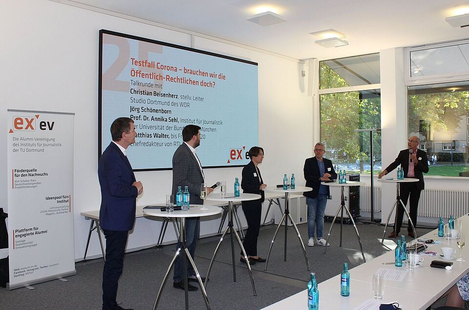Prof. Holger Wormer, geschäftsführender IJ-Direktor, sprach ein Grußwort auf der Jubiläumsveranstaltung, die Ende September im Dortmunder Baukunstarchiv NRW stattfand, und WDR-Programmdirektor Jörg Schönenborn, auch selbst EX-Mitglied, eine Keynote. In der anschließenden Talkrunde mit dem Titel „Testfall Corona – brauchen wir die Öffentlich-Rechtlichen doch?“ diskutierten neben ihm die Alumni Annika Sehl, Professorin für digitalen Journalismus am Institut für Journalistik der Universität der Bundeswehr München, Matthias Walter, bis Frühjahr 2020 Chefredakteur von „RTLzwei“, und Christian Beisenherz, stellvertretender Leiter des WDR-Studios Dortmund. Kay Bandermann, freier Wirtschaftsjournalist und Vorsitzender des Pressevereins Ruhr, führte als Moderator durch die Veranstaltung.