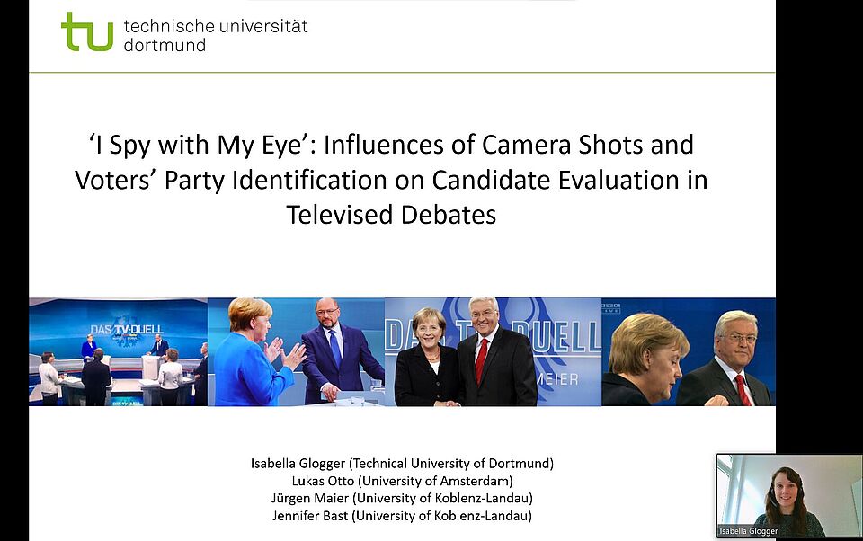 Isabella Glogger, Akademische Rätin a.Z. am IJ, präsentiert gemeinsam mit Jürgen Maier (Universität Koblenz-Landau), Lukas Otto (Universität Amsterdam) und Jennifer Bast (Universität Koblenz-Landau) die Ergebnisse eine Studie, in der sie den Einfluss von Kameraeinstellungen, d.h. Einstellungsgrößen und -winkel, auf die Bewertung von Kandidaten aus der Politik in TV-Duellen unter die Lupe genommen und überprüft haben, ob es Unterschiede dieses Effekts abhängig von der Parteiidentifikation der Zuschauer gibt. Dazu verknüpften sie Daten von Inhaltsanalysen, Befragungen und Real-Time-Response-Messungen von vier deutschen TV-Duellen.