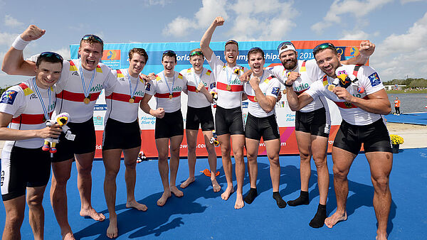 Eine halbe Bootslänge vor den USA und Italien erreicht das deutsche Team, das auf dem Dortmund-Ems-Kanal trainiert, als Sieger die Ziellinie in Sarasota. Es ist das erste WM-Gold für Max Planer.
