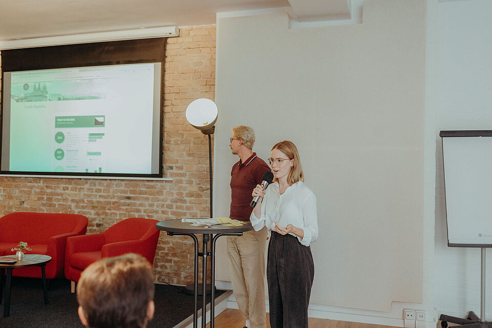 Dabei lernten sie die Bedeutung von Crossborder-Journalismus kennen und erlebten bei der Arbeit an eigenen Projekten, was internationale Zusammenarbeit ausmacht. In länderübergreifenden Gruppen beschäftigten sie sich mit den Themen Vertrauen in Nachrichten, Einfluss von Influencer:innen, Schönheitsideale, erneuerbaren Energien im Ländervergleich und Minderheiten im Journalismus.