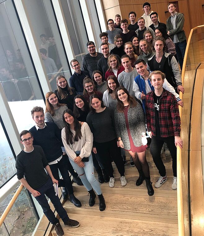 Studierende der Vorlesung „Öffentliche Aufgabe. Normative Grundlagen des Journalismus“ hatten am Freitag, 29.11.2019, die Gelegenheit, am Volontärsprogramm des Landtags NRW teilzunehmen. Begleitet wurden sie von Prof. Dr. Tobias Gostomzyk. Die Journalistik-Studierenden besuchten eine Plenarsitzung, in der neue Richter am Verfassungsgerichtshof des Landes Nordrhein-Westfalen und gewählt und vereidigt wurden und in der eine aktuelle Stunde zum Thema „Clankriminalität“ auf dem Programm stand.