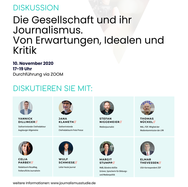 Gemeinsam mit Journalist*innen und Verteter*innen aus der Politik werden diese Ergebnisse nun bei unserer Digital-Konferenz zum Thema „Die Gesellschaft und ihr Journalismus. Von Erwartungen, Idealen und Kritik“ diskutiert.