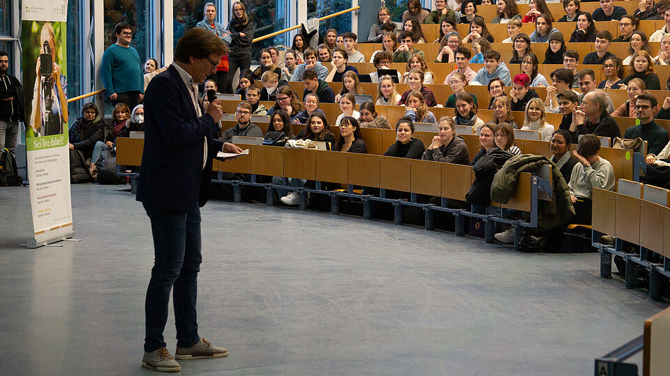 Bereits 2015 erklärte Mai Thi Nguyen-Kim auf ihrem YouTube-Kanal „The Secret Life of Scientists“ naturwissenschaftliche Themen für Laien. Ihr allererstes YouTube-Video, verrät sie im Gespräch mit Carlotta Wagner und Prof. Holger Wormer, sei aber ein Tanzvideo gewesen. Sie habe damals als Chemie-Doktorandin an einem Wettbewerb für Forschende teilgenommen und unter dem Titel „Dancing Drug Delivery“ ihre Forschungsergebnisse zu Wirkstofftransport „vertanzt“. Mit dem Tanzen habe sie Erfahrung gehabt - sie errang 2009 mit ihrer Formationsstepptanz-Gruppe den Weltmeistertitel und unterrichtete während ihrer Zeit als Doktorandin an der RWTH Aachen Hip-Hop – aber sie habe erst einmal nachschauen müssen, wie man Videos schneidet, erzählt sie lachend im Audimax der TU Dortmund.