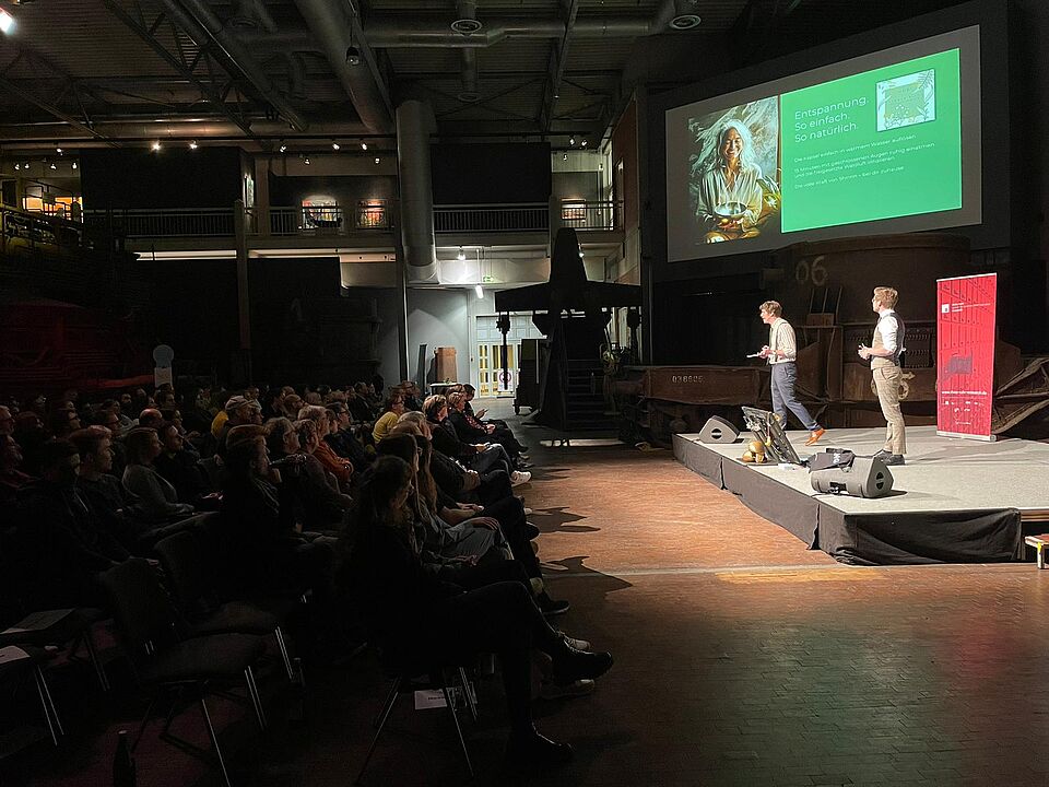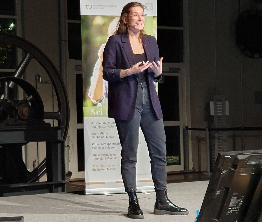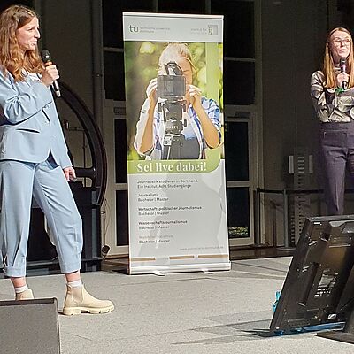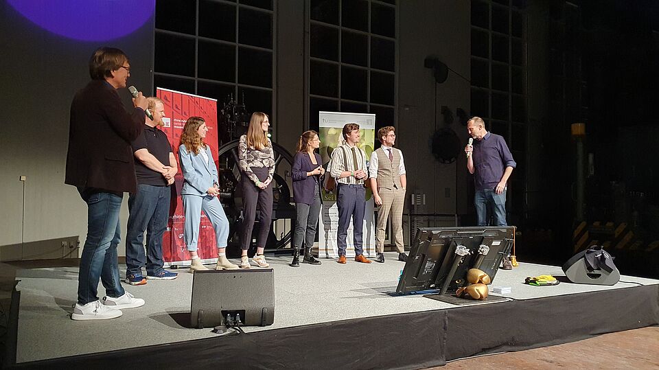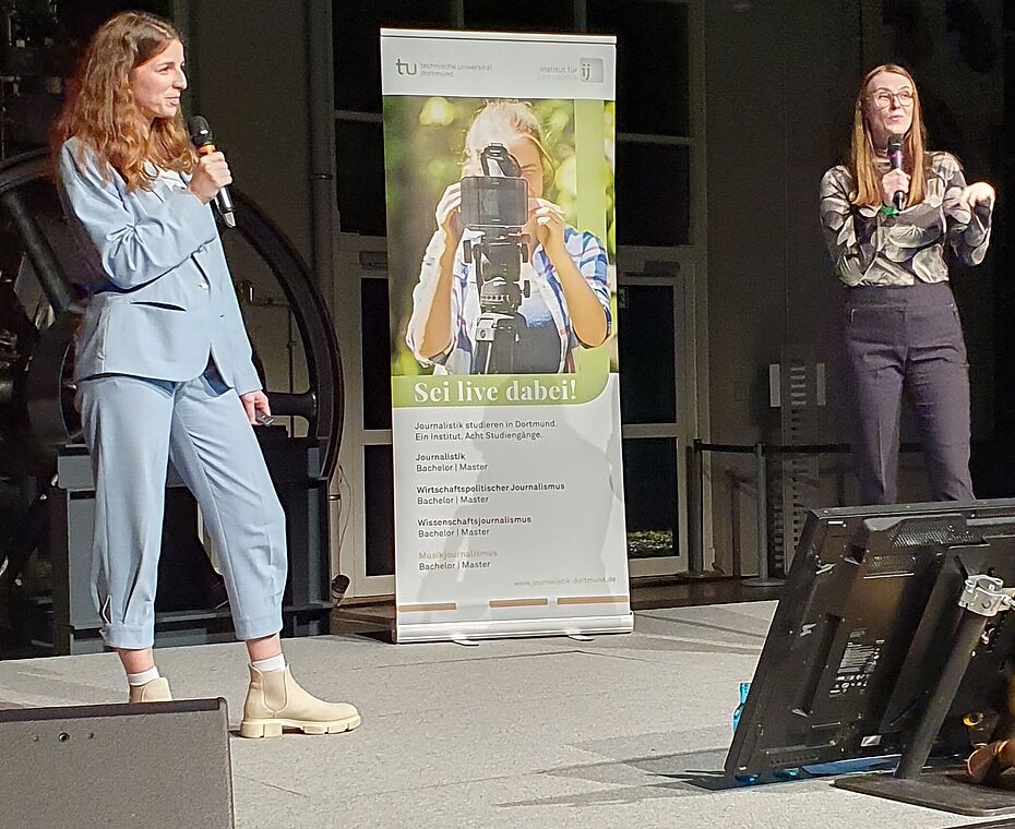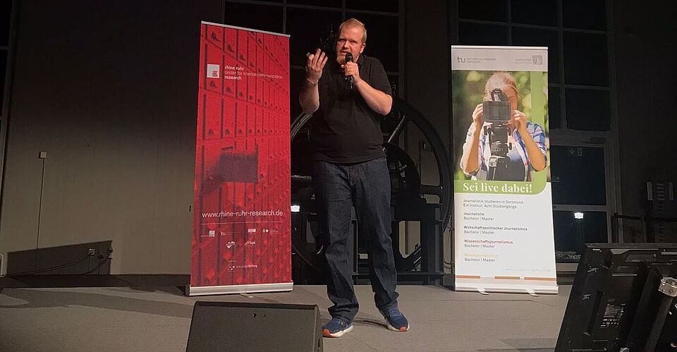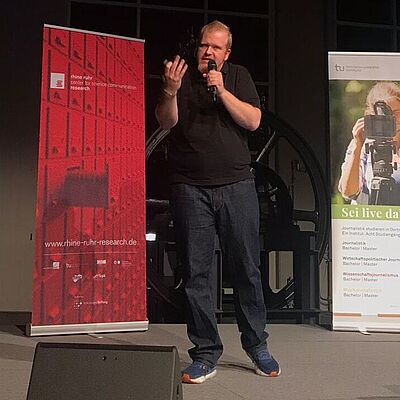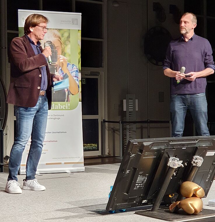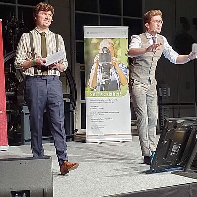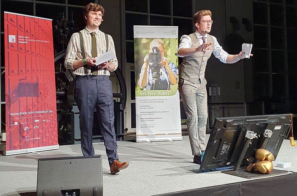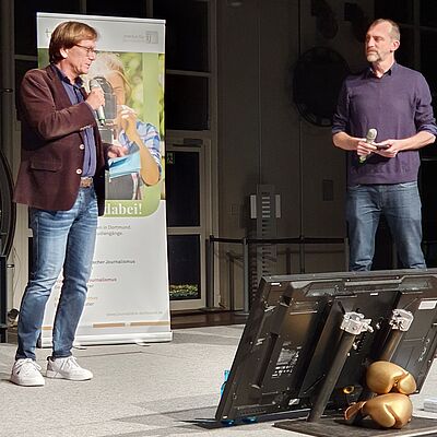 Sieger des Science & Journalism Slams wurden die Quarks Science Cops, Maximilian Doeckel und Jonathan Focke, beide Absolventen des Studiengangs Wissenschaftsjournalismus, mit einem Beitrag zu falschen Versprechen von Nahrungsergänzungsmitteln. Kapseln, die Stress und Anspannung tilgen sollen? Schön wär's und gäbe es diese wirklich, hätten die Science Cops mit Sicherheit auch viele Abnehmer:innen im Publikum gefunden, das aus vielen Journalist:innen und Wissenschaftler:innen bestand.