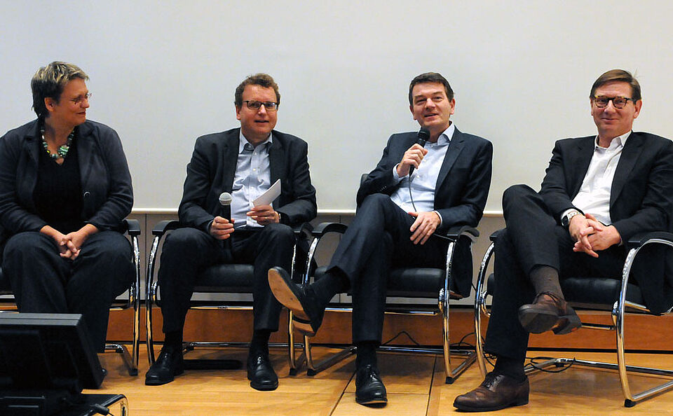 Prof. Dr. Stephan Russ-Mohl, Professor für Journalismus und Medienmanagement an der Università della svizzera italiana in Lugano, beschrieb Kurt Koszyk als Gründervater der Journalistik in Deutschland und betonte, wie wichtig es gerade in heutigen Zeiten des Umbruchs in der Medienlandschaft sei, sich für Qualitätsstandards in der Journalistenausbildung einzusetzen. Mehr als 1.000 Absolventen haben in den vergangenen 40 Jahren ihr Dortmunder Journalistik-Studium als Sprungbrett in die Medienwelt genutzt, darunter auch Sigrun Müller-Gerbes, Redakteurin bei der Bielefelder Tageszeitung „Neue Westfälische“, Friedrich Roeingh, Chefredakteur der „Allgemeinen Zeitung“ in Mainz, Jörg Schönenborn, Fernsehdirektor des WDR, und Dr. Thomas Schiller, Chefredakteur des Evangelischen Pressedienstes (epd). In einer Diskussionsrunde erinnerten sie sich an ihr eigenes Journalistik-Studium unter Kurt Koszyk.
