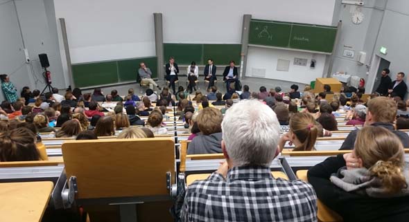 Seit dem 9. November steht fest, dass Donald Trump der nächste US-Präsident wird. Noch Tage später beherrscht der Ausgang der US-Wahl die Schlagzeilen. Und anscheinend fragen sich auch viele TU-Studierende: Wie geht es jetzt weiter? Der Hörsaal II ist bis auf den letzten Platz und darüber hinaus mit Menschen gefüllt, die vier Experten zuhören: Prof. Walter Grünzweig vom Institut für Anglistik und Amerikanistik, Politikwissenschaftler Prof. Christoph Schuck, Prof. Henrik Müller vom Institut für Journalistik und Prof. Kristian Kersting von der Fakultät für Informatik.