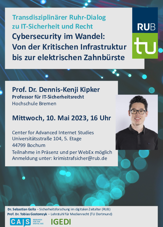 Die Gesprächsreihe Ruhr-Dialog IT-Sicherheit und Recht startet am 10. Mai 2023 um 16 Uhr mit einem Vortrag von Prof. Dr. Dennis-Kenji Kipker (Professor für IT-Sicherheitsrecht an der Hochschule Bremen) zum Thema "Cybersecurity im Wandel: Von der Kritischen Infrastruktur bis zur elektrischen Zahnbürste". Im Anschluss an den Vortrag wird es Gelegenheit zur Diskussion geben.